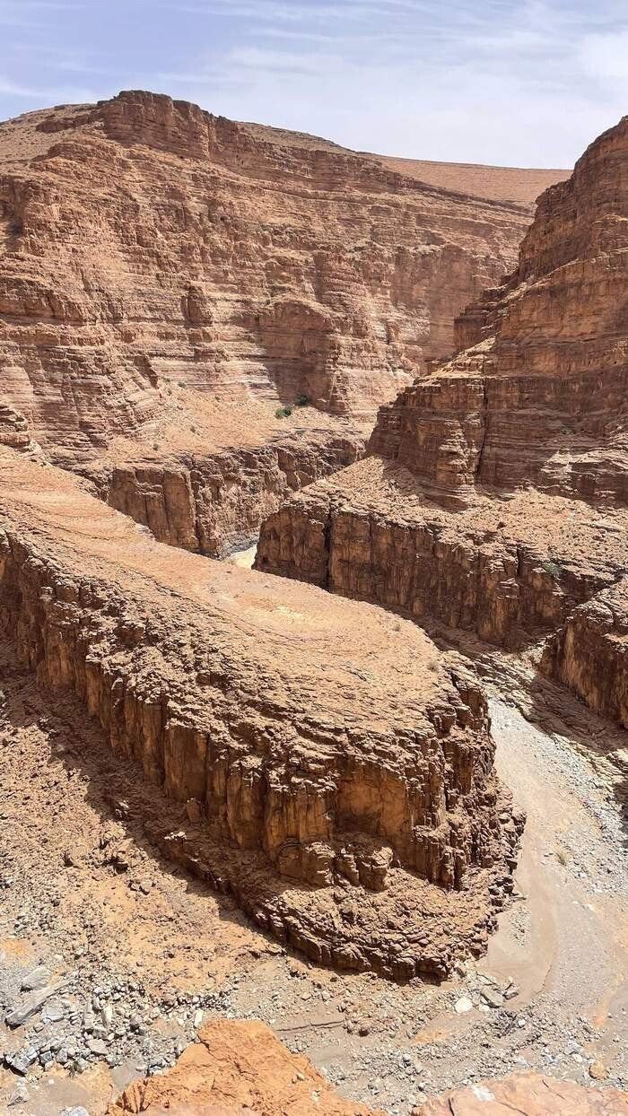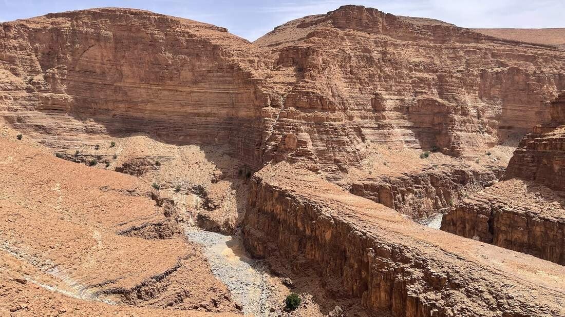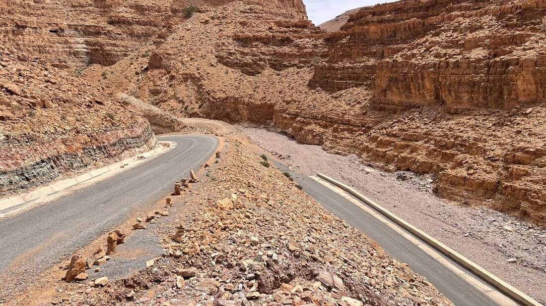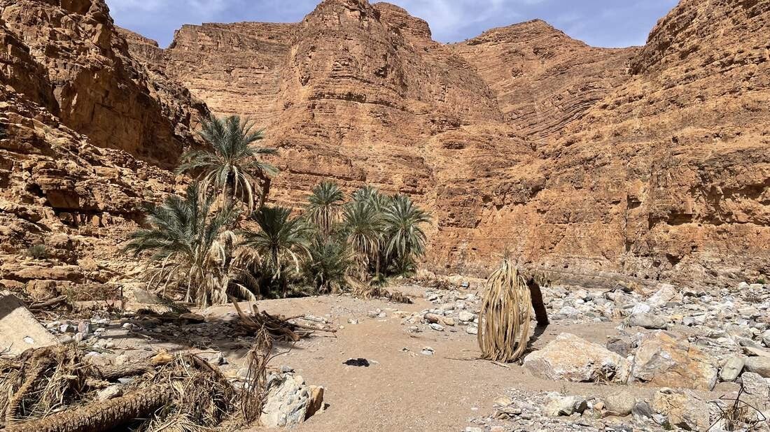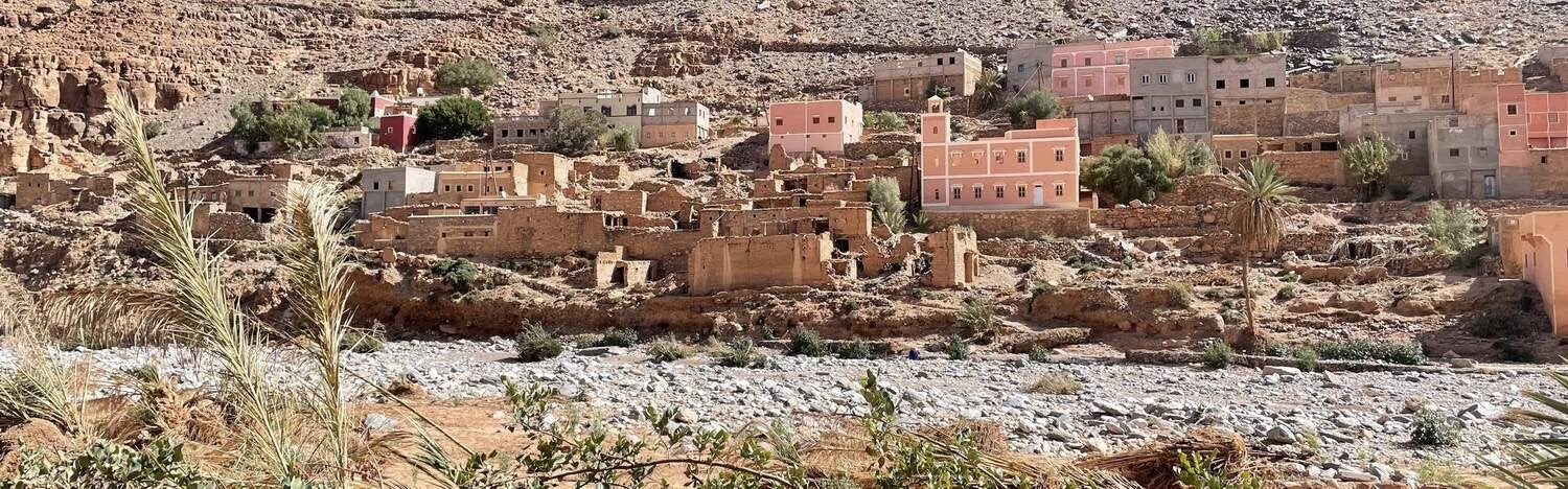 Wie nahe doch Naturschönheiten und Tragödien beieinander liegen, ist im unteren Teil dieser tollen Schlucht, in dem kleinen Dorf Aoukerda sehr gut zu sehen. Es ist beeindruckend, wie sich die Straße den wunderschönen Canyon entlang hinunter in das Dorf schlängelt – in den Reiseführern auch als „Kleiner Grand Canyon“ bezeichnet. Eine Landschaft, die im Südwesten der USA nicht schöner sein kann. Hinter den wenigen Häusern des Ortes, laufen durch die tiefen Schluchten des „Anti-Atlas“ mehrere trockene Flussbetten (s.g. Wadis) zusammen. Gesäumt werden die unteren Wadis von einer wunderschönen Oase – aber leider nur bis zum 08. September 2024. Aufgrund tagelanger und massiver Regenfälle in den umliegenden Bergen, wälzte sich an diesem Tag eine enorme Schlamm- und Gerölllawine durch die Wadis rund um und durch das Dorf Aoukerda. Sie riss alles mit, was sich ihr in den Weg stellte. Die Häuser die nicht mitgerissen wurden, sind danach größtenteils unbewohnbar. Für 12 Bewohner kam jede Hilfe zu spät und bis heute werden noch mehrere Menschen vermisst. Erschwerend kam hinzu, dass Hilfe erst Tage später eintreffen konnte. Mehrere Kilometer der Zufahrtsstraße waren einfach weggeschwemmt oder verschüttet. Sie mussten erst mit schwerem Gerät geräumt werden. So steht heute das kleine Dorf Aoukerda in Marokko für das Ahrtal in Deutschland. Nur mit dem feinen Unterschied, dass in Deutschland eine nie zuvor dagewesene Hilfs- und Spendenbereitschaft entbrannte – in Marokko kennt kaum jemand das Dorf Aoukerda. Was bleibt, ist nach wie vor der imposante Canyon, eingebettet in eine grandiose Landschaft des Anti-Atlas. An dessen unteren Ende sich das kleine Dorf Aoukerda befindet, wo ein paar wenige Menschen versuchen ihr Schicksal zu meistern.