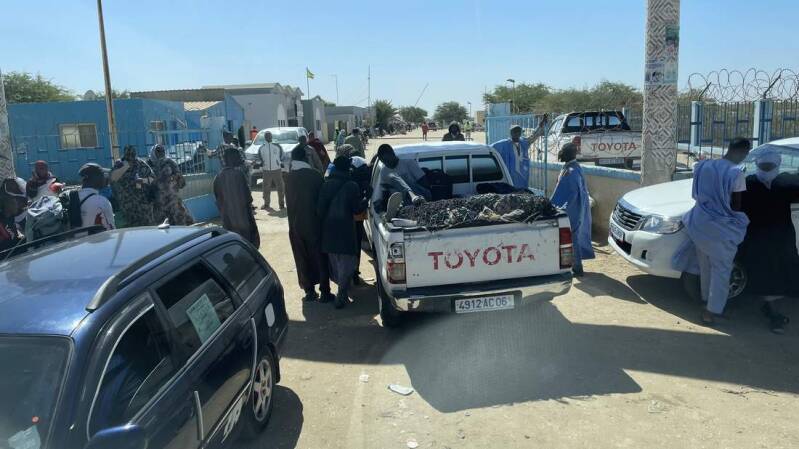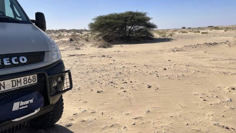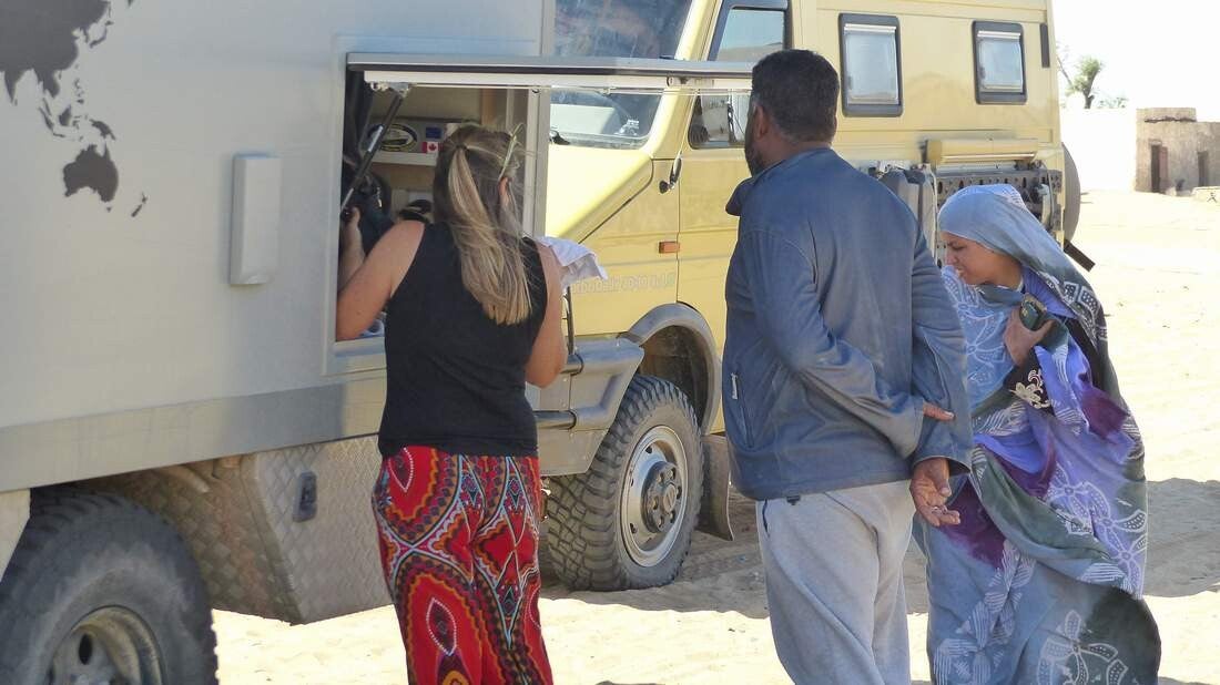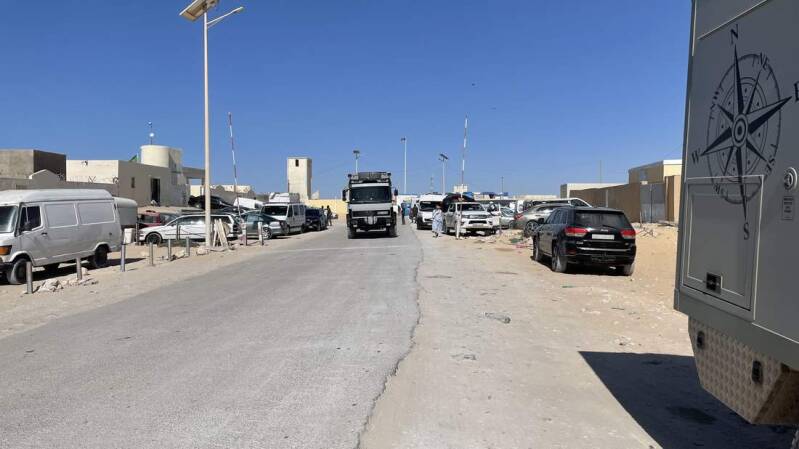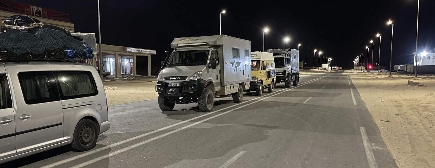 Wir sind an der Grenze zu Mauretanien angekommen und zwischenzeitlich mit vier Fahrzeugen unterwegs. Mit Dorothea, Volker und ihrem MB Reisetruck sind wir bereits seit Beginn des Jahres auf Achse. Atilla war schon mehrfach mit seinem 4x4 Sprinter im Senegal und konnte uns viele Tipps geben. Er möchte nur nicht alleine die Wüstentour entlang der Eisenerzbahn fahren. Ab der Grenze gesellt sich dann noch ein weiterer Iveco, mit Nicole und Knuth dazu. Schon am frühen Morgen stellen wir uns in die Reihe, damit es bei der Grenzöffnung für die Ausreise aus Marokko schneller geht. Bei der Visaabfertigung stellen wir fest, dass wir eine Punktlandung hingelegt haben – nach exakt 90 Tagen reisen wir aus. Danach geht es mit dem Fahrzeug durch den Scanner – alles ok. Nach Aushändigung der Papiere fahren wir durch drei Kilometer Niemandsland und erreichen das Territorium von Mauretanien. Jetzt vertrauen wir uns "Sheik" an, der quasi als „Grenzhelfer“ alles für uns erledigt – Visum, Passavant und Kfz-Versicherung sowie Geldwechsel zu einem guten Kurs. Dank seiner Hilfe findet auch die Kontrolle des Fahrzeuges so gut wie nicht statt – Einfuhren von Alkohol und Schweinefleischprodukten sind nämlich verboten. Nach ca. 90 Minuten sind wir durch und reisen nach Mauretanien ein.