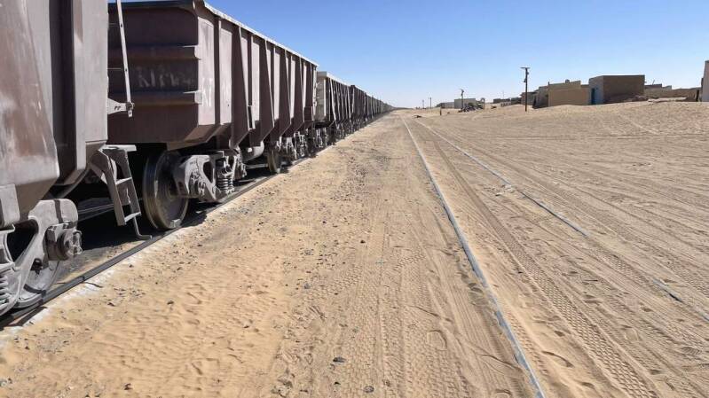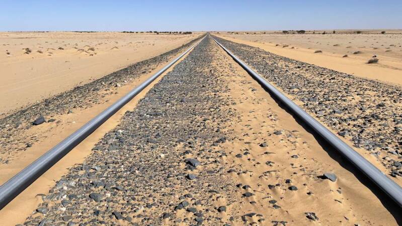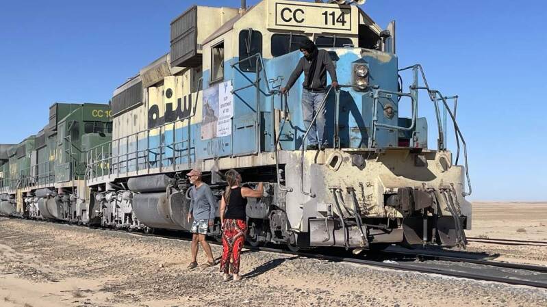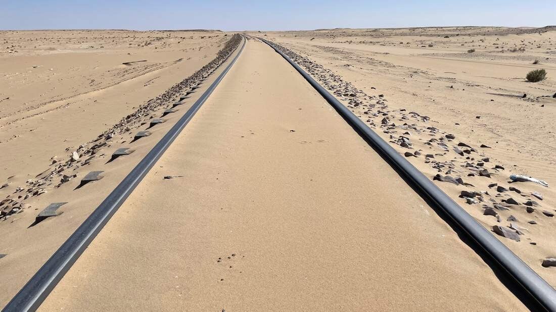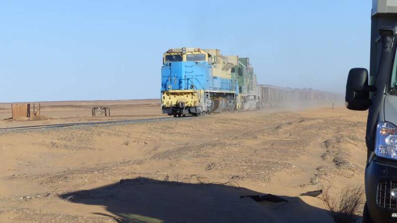 Die Piste verläuft immer entlang dem Schienenstrang. Mal etwas näher dran, mal etwas weiter weg davon – aber permanent in Sichtweite. Es dauert nicht lange, bis wir den ersten Zug mit etwa 150 Waggons zu sehen bekommen. Teilweise sollen es schon mehr als 200 gewesen sein, dann ist er sogar über 3km lang. Bereits von Weitem kann man den Strahltross mit den drei mächtigen angehängten Loks erkennen bzw. hören. Viele Einheimische benutzen die Eisenerzwaggons auch als kostenlose Mitfahrgelegenheit. Nachdem alle Waggons vorüber sind, verschwindet der gesamte Stahlverband wieder in einer riesigen Sand- und Staubwolke.