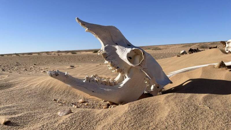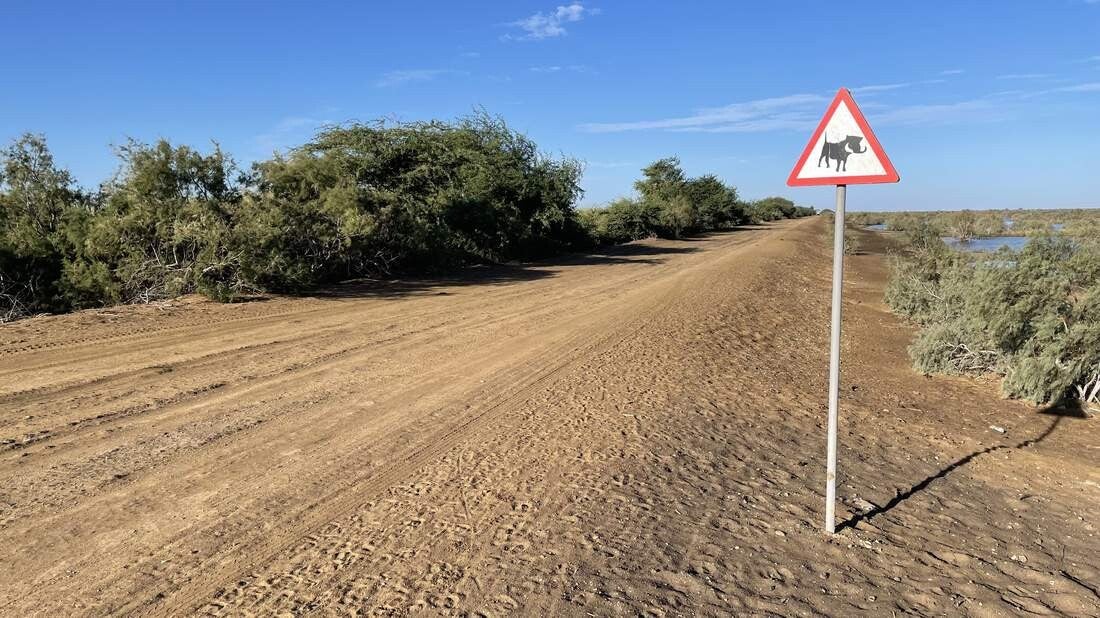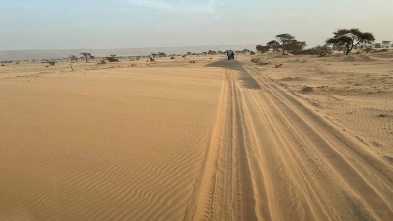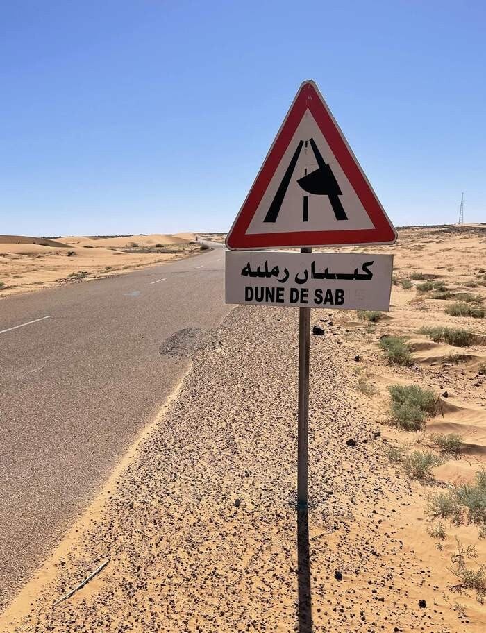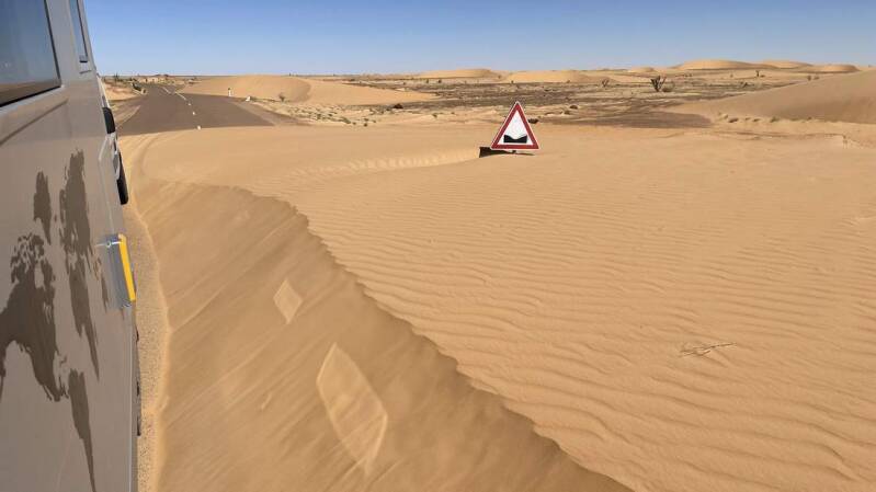 Auf unserer weiteren Fahrt in den Süden Mauretaniens, folgen wir zumeist der "N3". Was hier als "Nationalstraße" deklariert ist, entpuppt sich für uns sehr oft als eine Sandpiste. Wir durchfahren viele Dünenfelder, durch die auch diese Straße führt. Ganze Ortschaften versinken langsam aber sicher im Sand – die Wüste breitet sich unaufhaltsam immer weiter aus. Dazu lernen wir ganz neue Verkehrsschilder kennen, die hier hier am Straßenrand aufgestellt sind. Andere wiederum verschwinden in den Sanddünen.