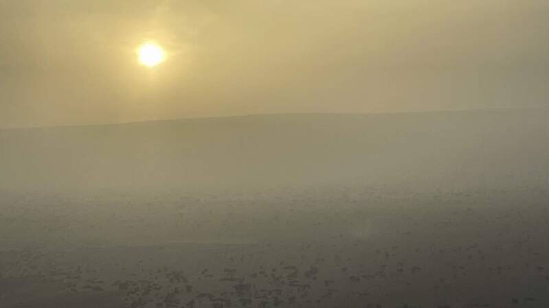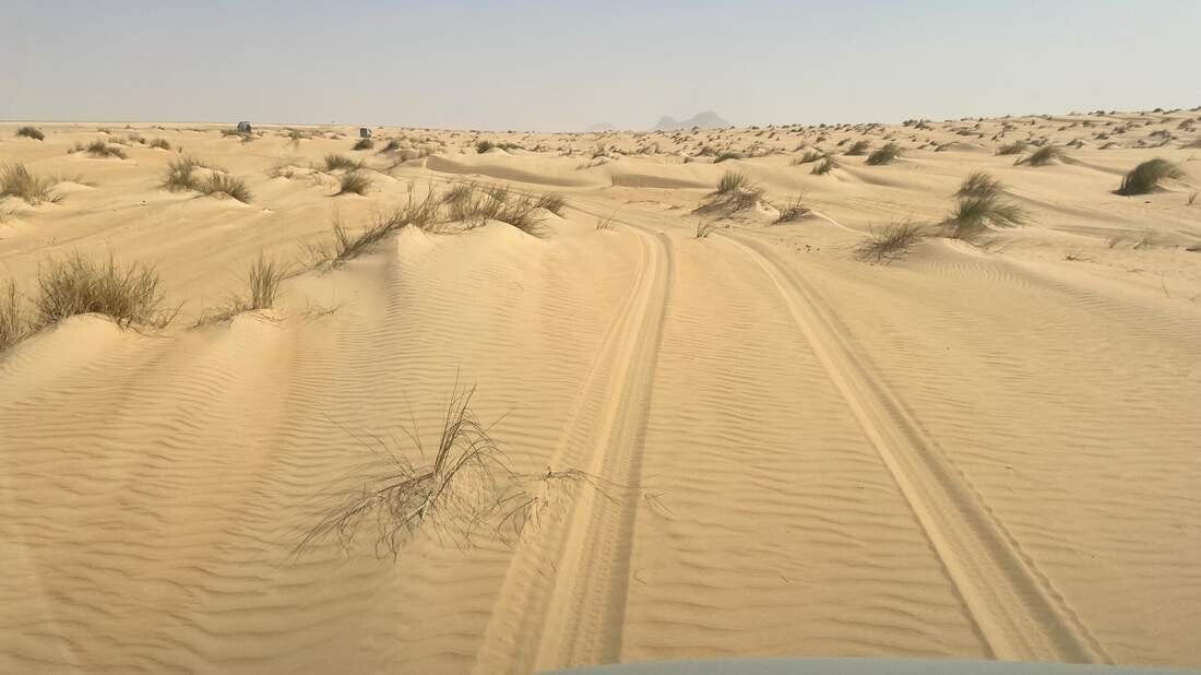 Wir wollen jetzt zusehen dass wir aus diesem Sandkasten rauskommen, da sich ein Sandsturm ankündigt – denn dann wird das Navigieren richtig schwer und die Piste ist kaum noch zu erkennen. Nachdem wir wieder Asphalt unter den Rädern haben und auch der Reifendruck wieder auf einem normalen Wert gebracht ist, können wir bereits die ersten Auswirkungen des Sandsturms sehen.