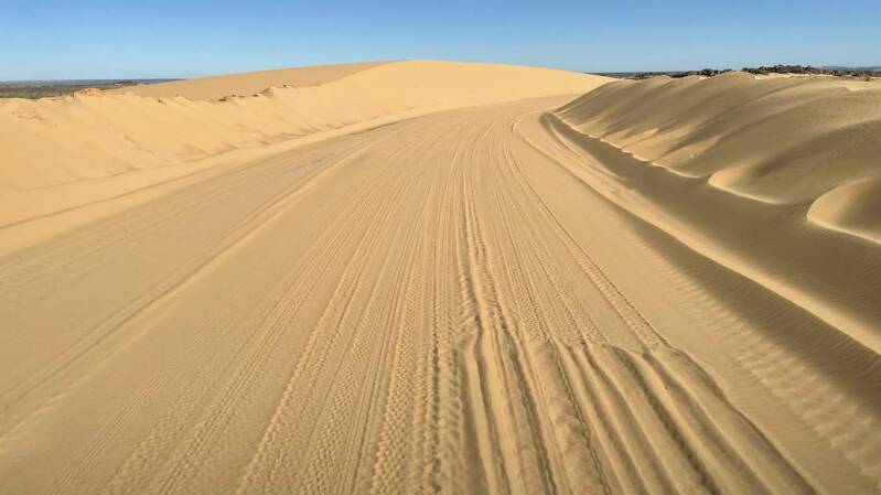 Nach ein paar doch noch recht heftigen Sandpassagen, sehen wir schon von weitem den „Ben Amira“. Dabei handelt es sich um den größten Monolithen Afrikas sowie dem drittgrößten, neben dem Uluru und dem Mt. Augustus in Australien, weltweit. Unter einem Monolithen versteht man einen zusammenhängenden Felsen, der aus nur einer Gesteinsart besteht – in diesem Fall aus Granit. Doch um an den 633m hohen Felsen zu gelangen, müssen wir uns zunächst eine geeignete Gleisüberfahrt suchen.