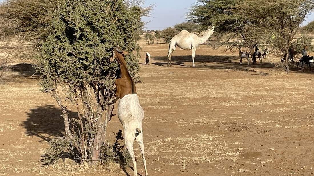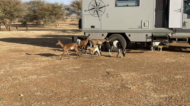 An einem unserer Übernachtungsplätze in der Savanne, bekommen wir am Morgen Besuch von einer kleinen aber sehr zutraulichen Ziegenherde. Später gesellen sich auch noch ein paar Kamele dazu – darunter auch ein eher selten zu sehendes weißes Kamel.