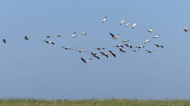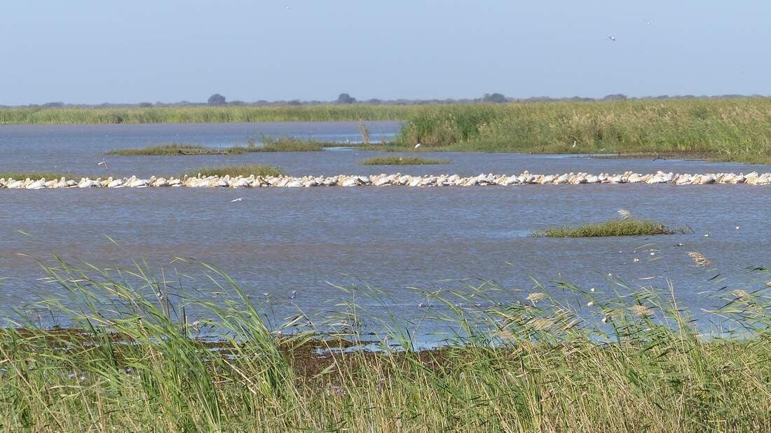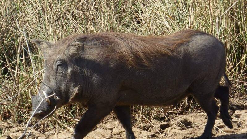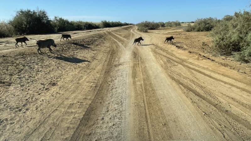 Und wieder lernen wir ein neues Verkehrsschild kennen: "Warzenscheine kreuzen". Es dauert auch nicht lange, bis wir die ersten Borstentiere zu sehen bekommen – besonders scheu sind sie allerdings nicht. Neben den Warzenschweinen gibt es natürlich auch reichlich Vögel zu beobachten. Außer den üblichen Flamingos und Reihern, sehen wir diesmal auch viele Pelikane. Leider können wir von den angekündigten Krokodilen keines in den umliegenden Gewässern entdecken.