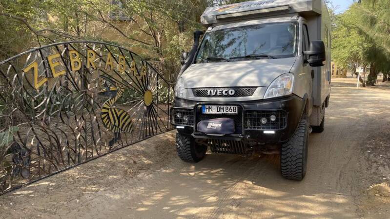Nach über zwei Stunden und einem reduzierten Barvermögen sind wir durch. Unser erstes Ziel ist die „Zebrabar“ bei Gandiol. Hier betreiben die Schweizer Ursula und Martin einen tollen Campingplatz, der seit fast drei Jahrzehnten ein beliebter Treffpunkt für alle Afrika Reisenden ist. Egal aus welcher Richtung kommend, ein Stopp in der Zebrabar ist Pflicht. Hier werden Erfahrungen und die neuesten Infos untereinander ausgetauscht. Und wenn mal alle Stricke reißen, dann stehen die Beiden mit Rat und Tat zur Seite.