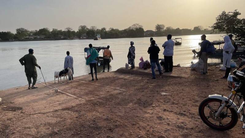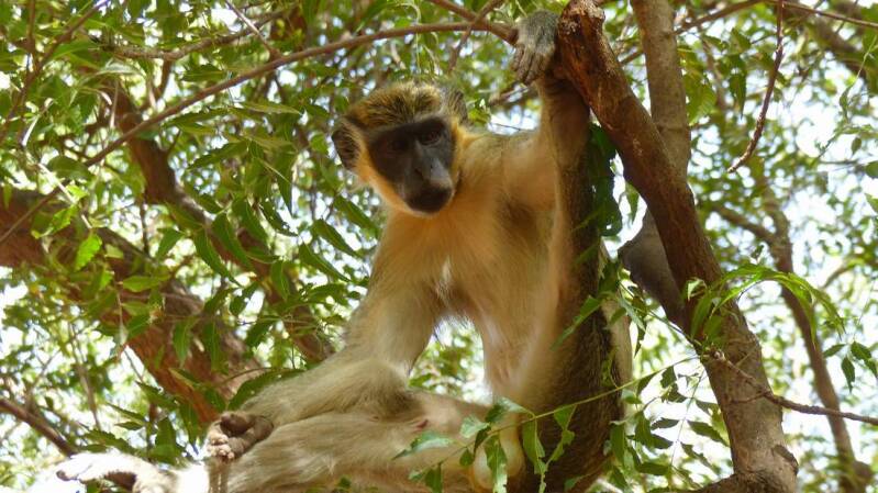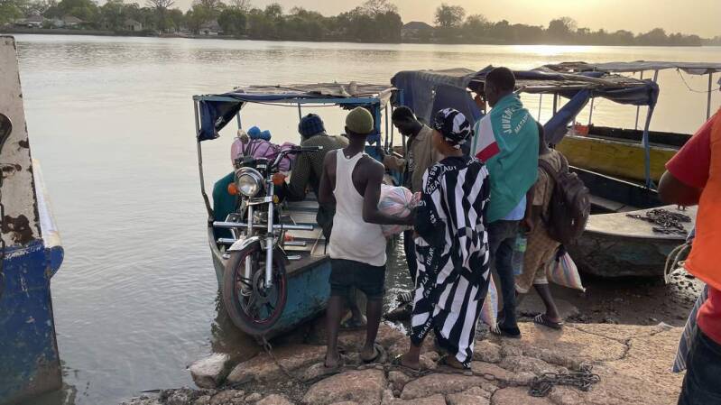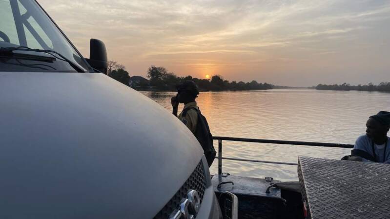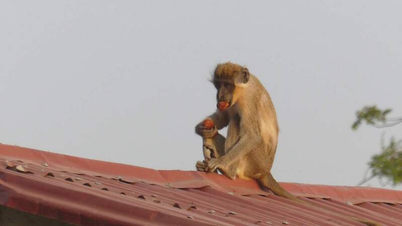 Noch vor Einbruch der Dunkelheit stehen wir vor Janjanbureh am Ufer des Gambia. Unter den wachsamen Augen eines jungen Guinea-Pavians, der gerade ein paar Früchte geklaut hatte, reihen wir uns in die Warteschlange zur Fähre ein. Da in Afrika alles etwas gemütlicher zugeht und an Fahrpläne gar nicht zu denken ist, können wir erst kurz vor der Dämmerung über den Fluss fahren.