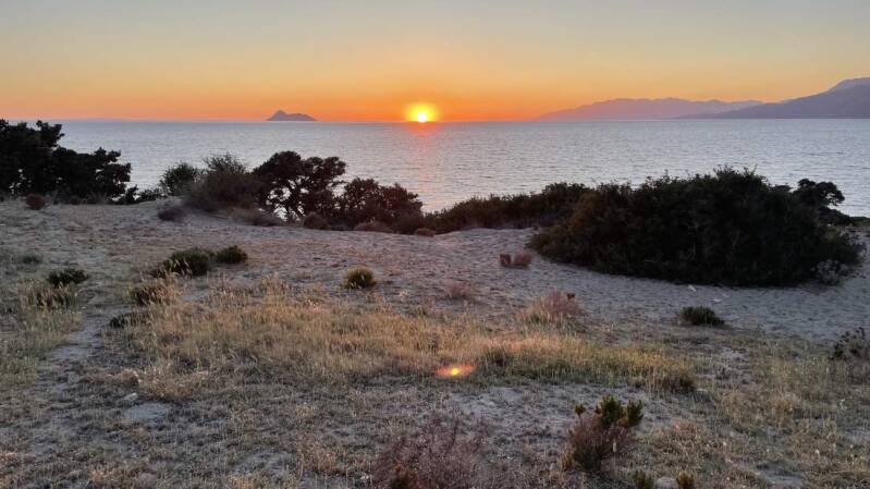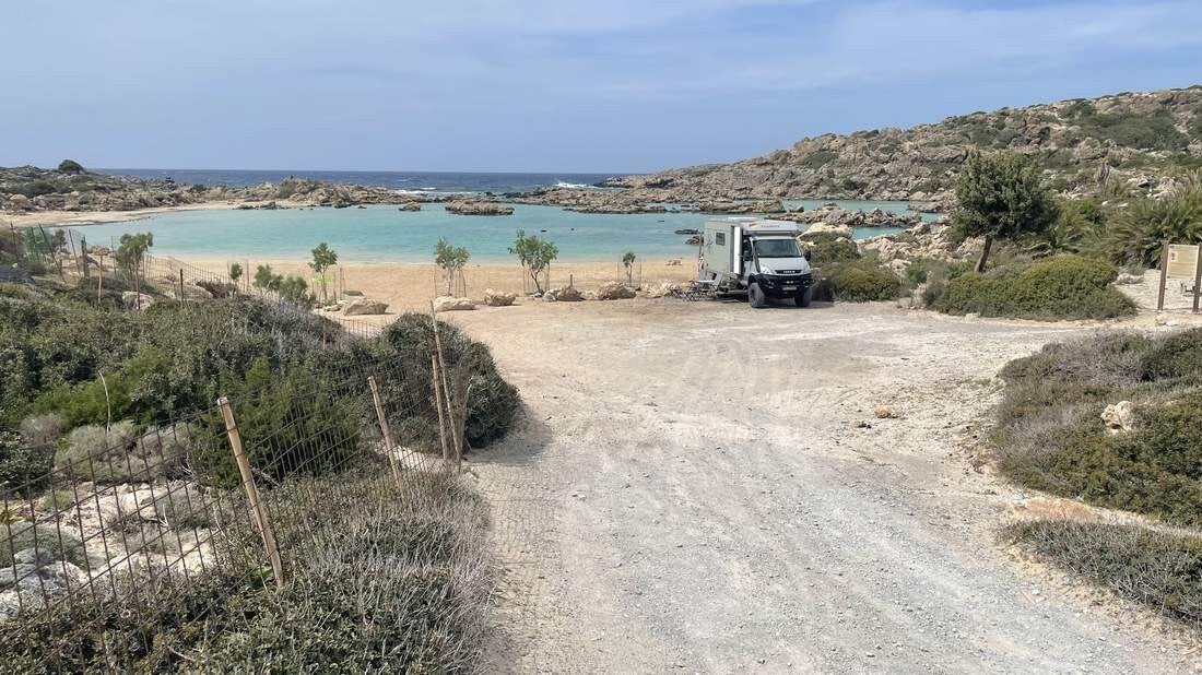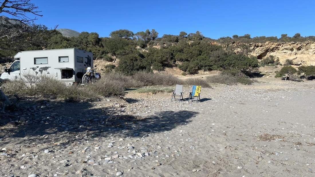 Einen weiteren traumhaften Stellplatz entdecken wir am Strand von „Aspri Limni“ – den "White Lake Beach". Es ist die kleinere Ausgabe der berühmten „Ochsenbauchbucht“ auf der Peloponnes, aber mindestens genauso schön. Obwohl die Mietwagenflotte auf der Insel sichtbar zugenommen hat, bleiben manche Strände und Orte bis dato noch von den Touristenmassen noch verschont.