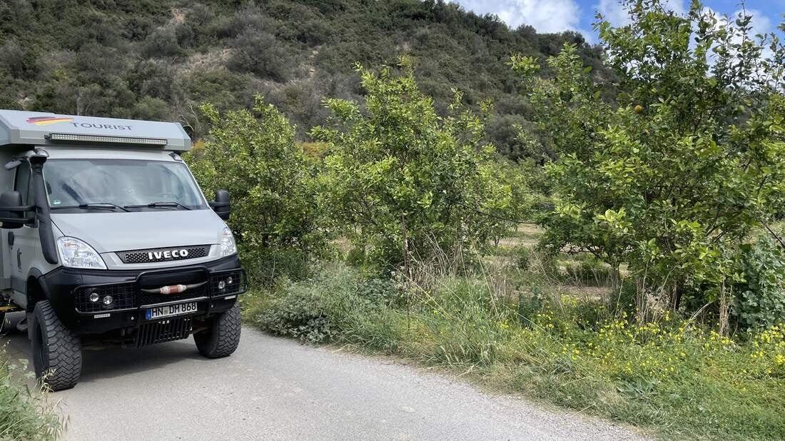 Eine Schlechtwetterfront mit Starkwind und aufgewühlter See sitzen wir in einem kleinen Küstenwäldchen, nahe Platanias an der Nordküste aus. Nachdem sich das Sauwetter verzogen hat, wollen wir erneut hoch in die „Lefka Ori“ – die "Weißen Berge" fahren. Zunächst geht es kilometerlang durch Orangen- Mandarinen- und Zitronenplantagen hindurch. Viele der Bäume stehen momentan in voller Blüte und verbreiten einen wunderbaren Duft.