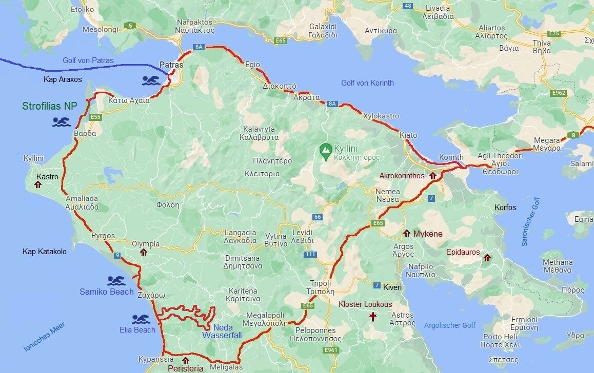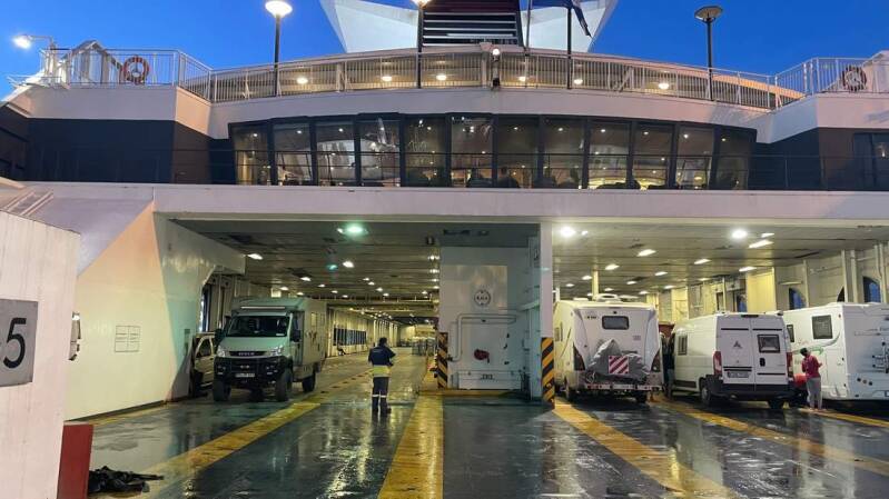 Noch ein Stück durch den Nationalpark und dann entlang des „Golf von Patras“ führt unser Weg in Richtung Hafen. Auf ein letztes Mal genießen wir vor Patras das Strandleben sowie einen leckeren „Pita Gyros“. Beim Einchecken erfahren wir, dass die Fähre erst gegen 22:00 Uhr ablegt. So haben wir noch genügend Zeit für diverse Einkäufe und dem Iveco wieder einen „sauberen Look“ zu verpassen. Klar, an den Waschanlagen herrscht heute natürlich absoluter Hochbetrieb.