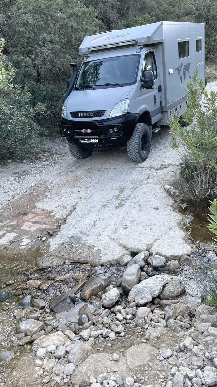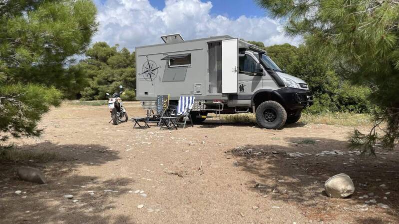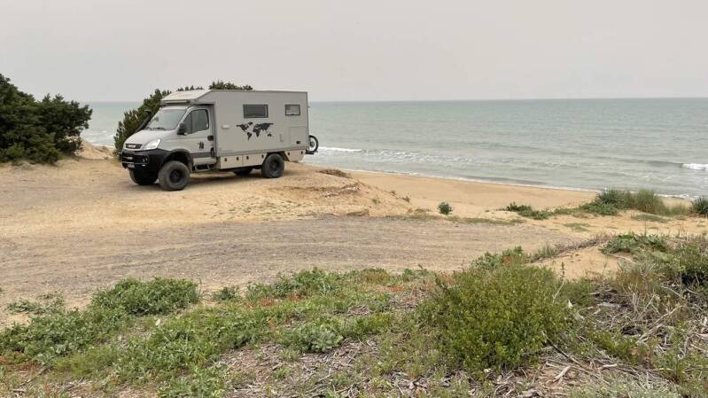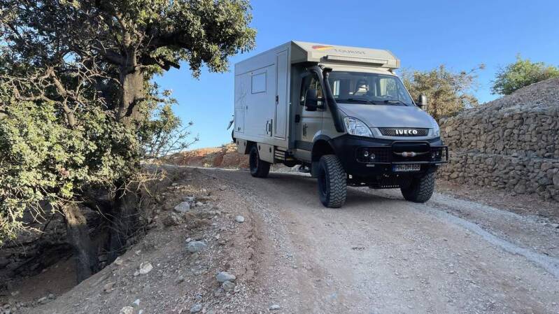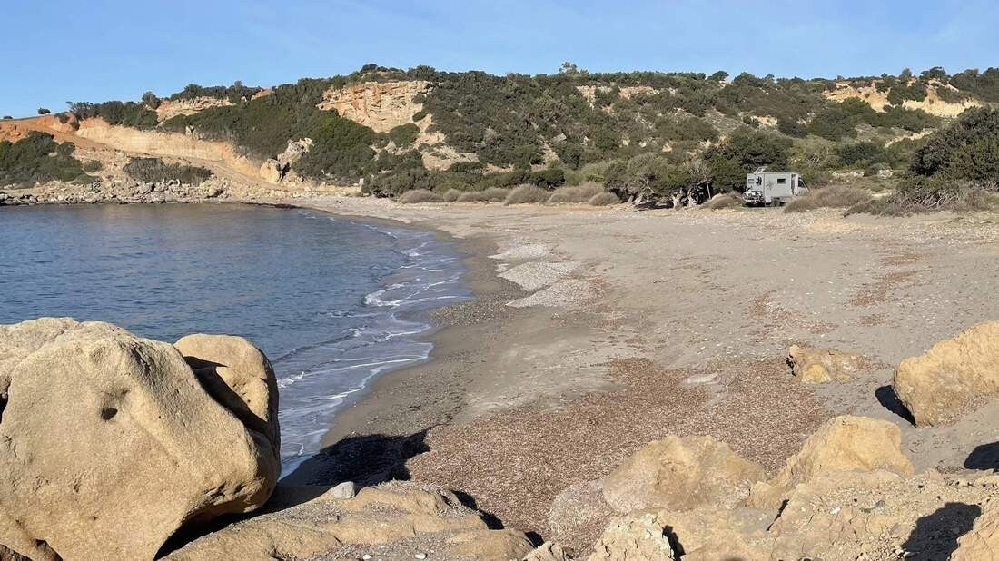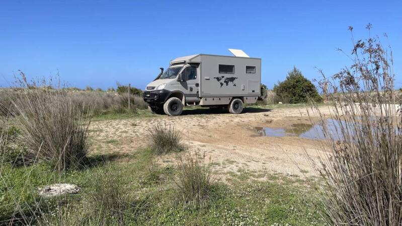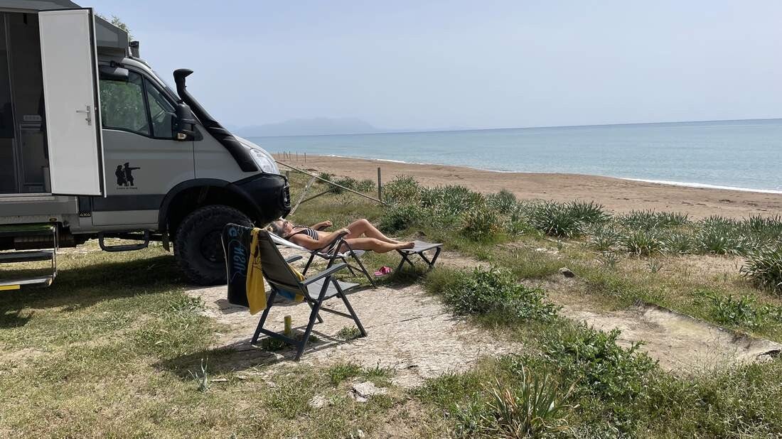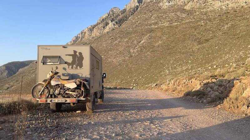 Nachdem wir dann auch noch den Iveco von all dem Sand und Pistenstaub wieder befreit haben, fahren wir für die verbleibende Zeit ein weiteres Mal an den Lakki Beach, im Süden von Kreta. Dabei ist das letzte Stück allerdings nochmals recht anspruchsvoll – aber dafür werden wir mit einem fantastischen Stellplatz direkt am Strand belohnt.