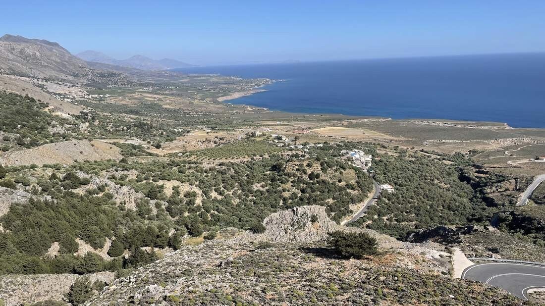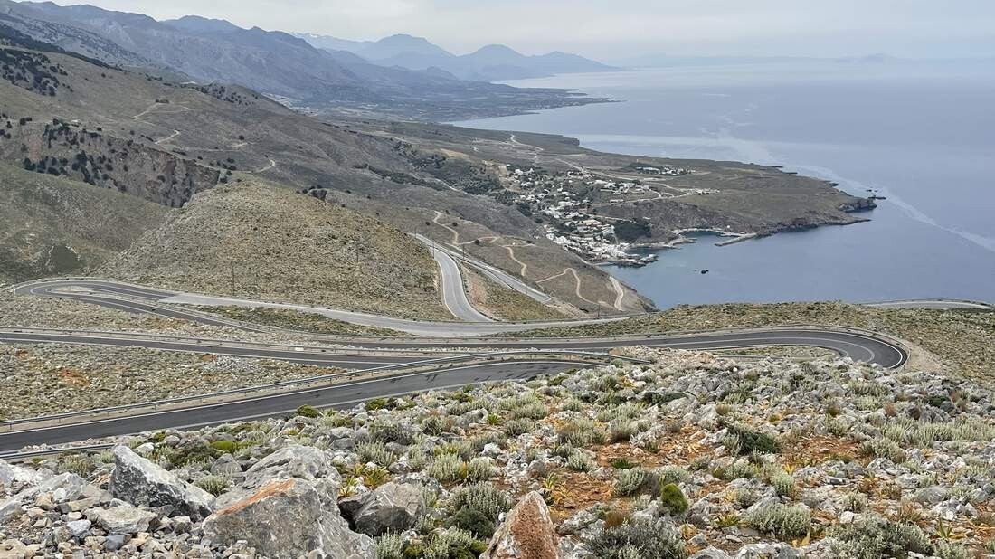 Neben einem ausgiebigen Strandleben unternehmen wir von hier aus noch eine größere Motorradtour in die „Weißen Berge“. Über unzählige Serpentinen schraubt sich die schmale Straße von der Küste aus bis auf fast 1.000m hinauf. Danach folgt eine hügelige Hochebene auf der nur wenige kleine Dörfer, aber dafür umso mehr Schafe und Ziegen zu finden sind. Entlang der Imbros Schlucht windet sich die Straße erneut der Küste entgegen nach unten.
