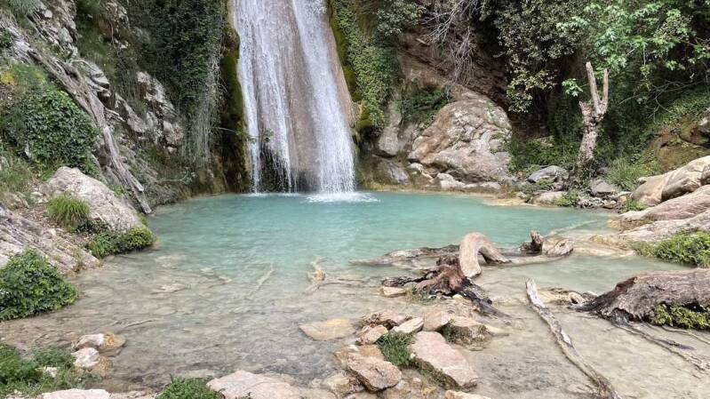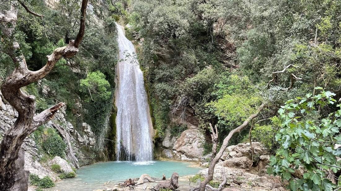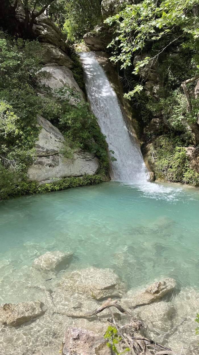 Noch einmal nehmen wir das Motorrad runter. Als Ziel haben wir uns den „Neda Wasserfall“ ausgesucht. Die Anfahrt dorthin führt wieder über unzählige Serpentinen hoch ins Gebirge, wo es langsam immer kühler wird. Nach einem längeren Fußmarsch werden wir mit zwei aufeinanderfolgende Wasserfälle belohnt, zu deren Füßen sich Pools mit kristallklarem Wasser befinden.