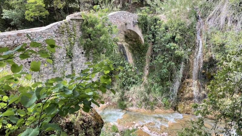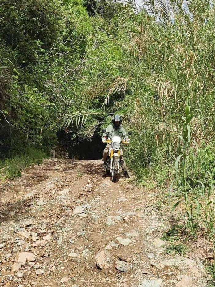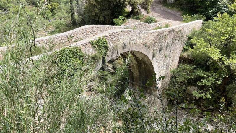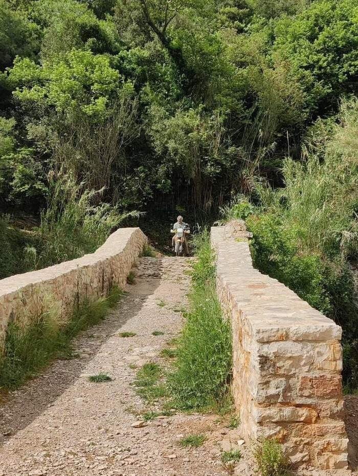 Für die Rückfahrt wählen wir eine etwas kürzere Strecke. Doch zuvor müssen das Motorrad und wir noch eine ziemlich holprige Abfahrt sowie eine schmale osmanische Steinbrücke hinter uns bringen.