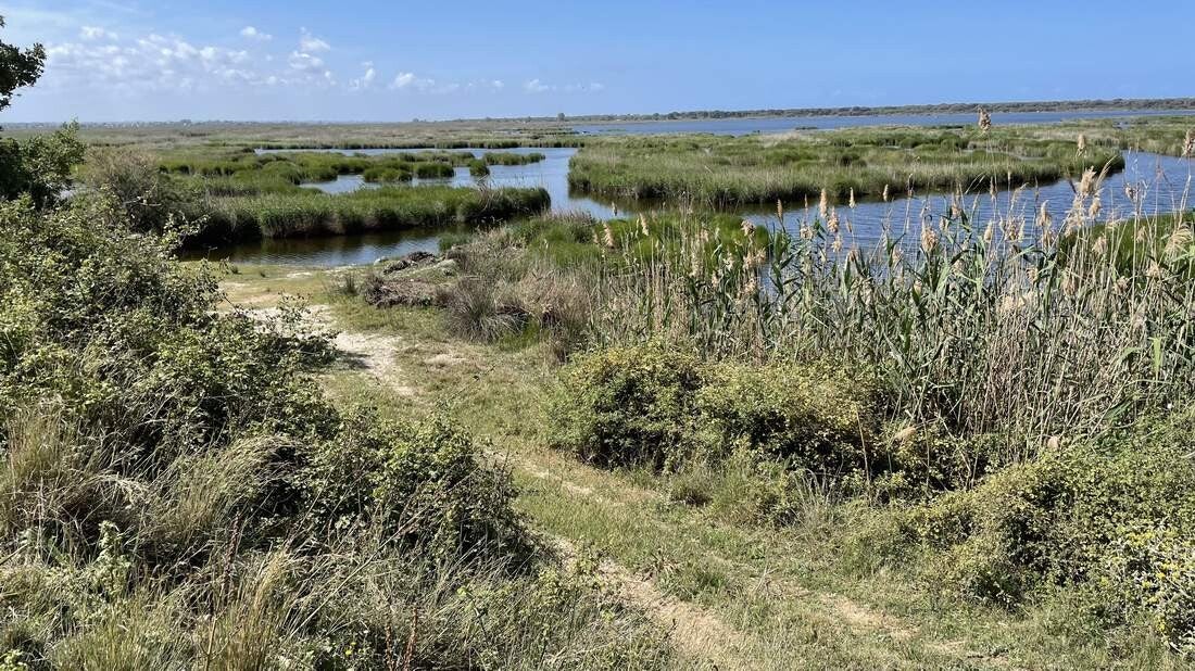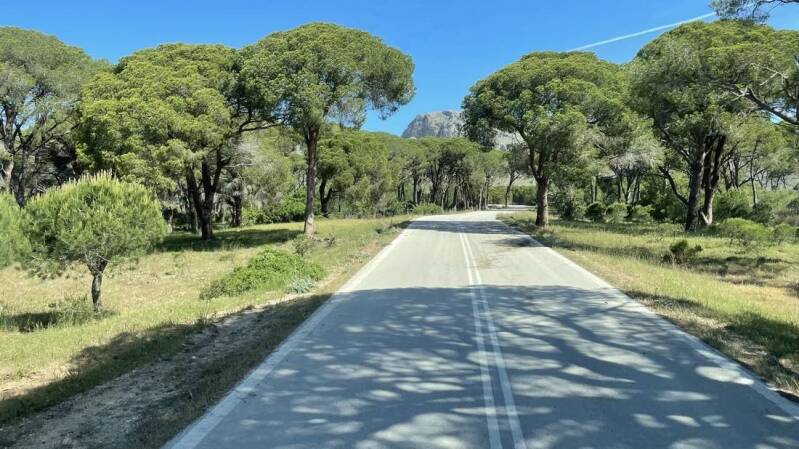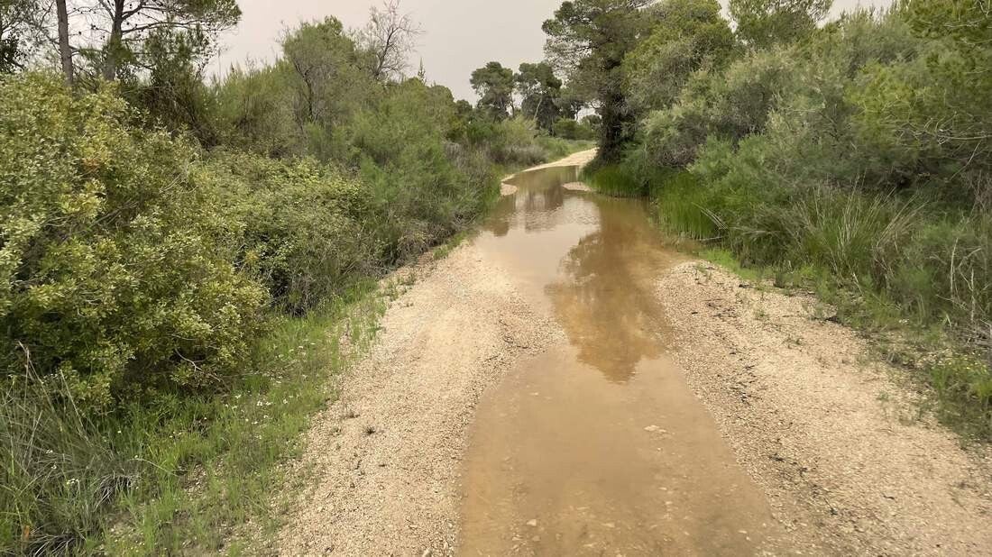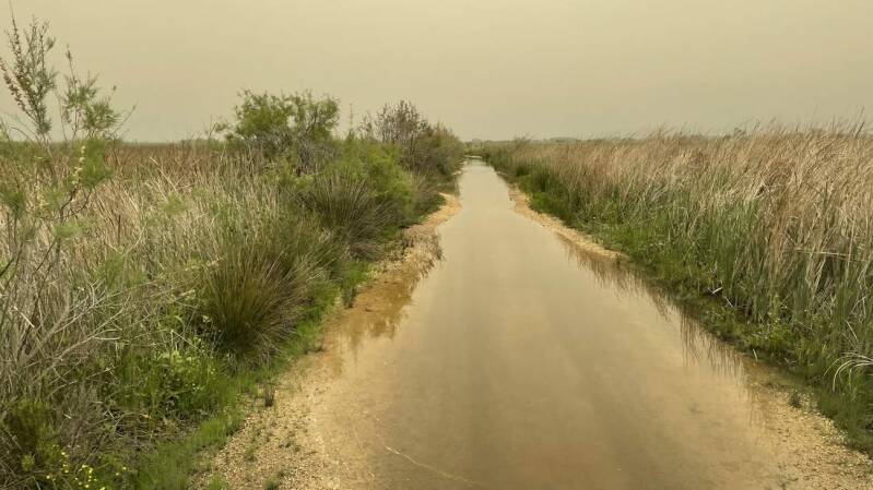 Die Fahrt durch den Nationalpark ist erneut ein absolutes Highlight. Auf etwa 10km geht es durch eine sattgrüne Marschlandschaft sowie durch dichte Kiefern-, Pinien- und Eichenwälder. Teilweise ist die Schotterpiste nach dem üppigen Regen der letzten Tage noch überflutet. Trotzdem genießen wir die Fahrt zu unserem letzten Übernachtungsplatz, hier in Griechenland für diese Reise. Nein, wir haben keinen Filter auf der Kamera. Bedingt durch den Saharastaub, umgibt uns nach wie vor ein äußerst diffuses Tageslicht.