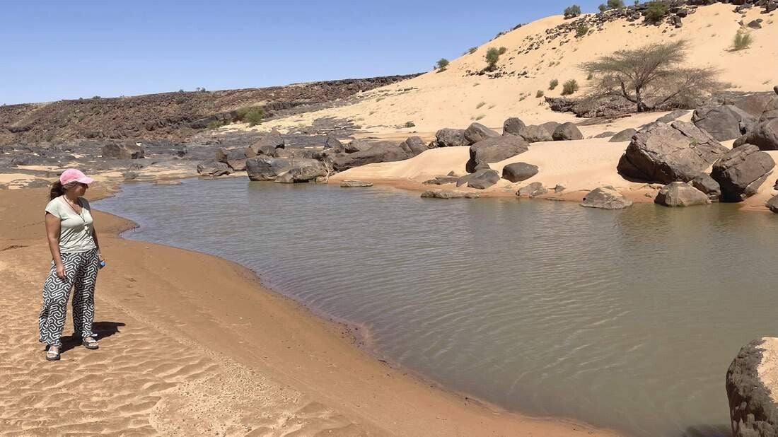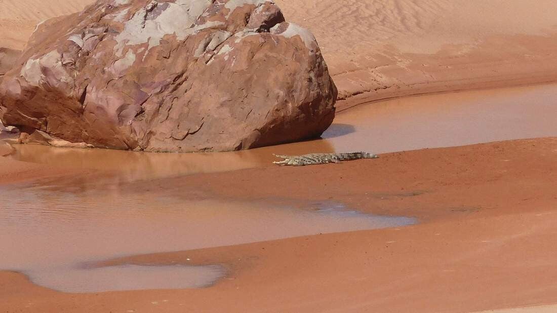 Nach einer kurzen Wanderung durch unwegsames Terrain, können wir die braune Brühe des „Matmata Guelta“ sehen. Doch vom Rand der Klippen aus ist kein einziges Krokodil zu erkennen. Die äußerst scheuen und bis 1999 ausgestorben geglaubten Reptilien nehmen jede Bewegung in der näheren und weiteren Umgebung wahr und gehen in Deckung. Wir suchen uns ein Plätzchen und warten. Bereits nach 15min lässt sich das erste Exemplar blicken und so nach und nach tauchen immer mehr der extrem scheuen Echsen auf, um sich am Ufer des Wasserlochs zu sonnen. Bis zu 14 Tiere können wir auf einen Blick erspähen – wir sind begeistert.