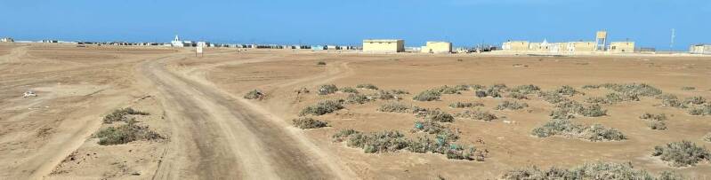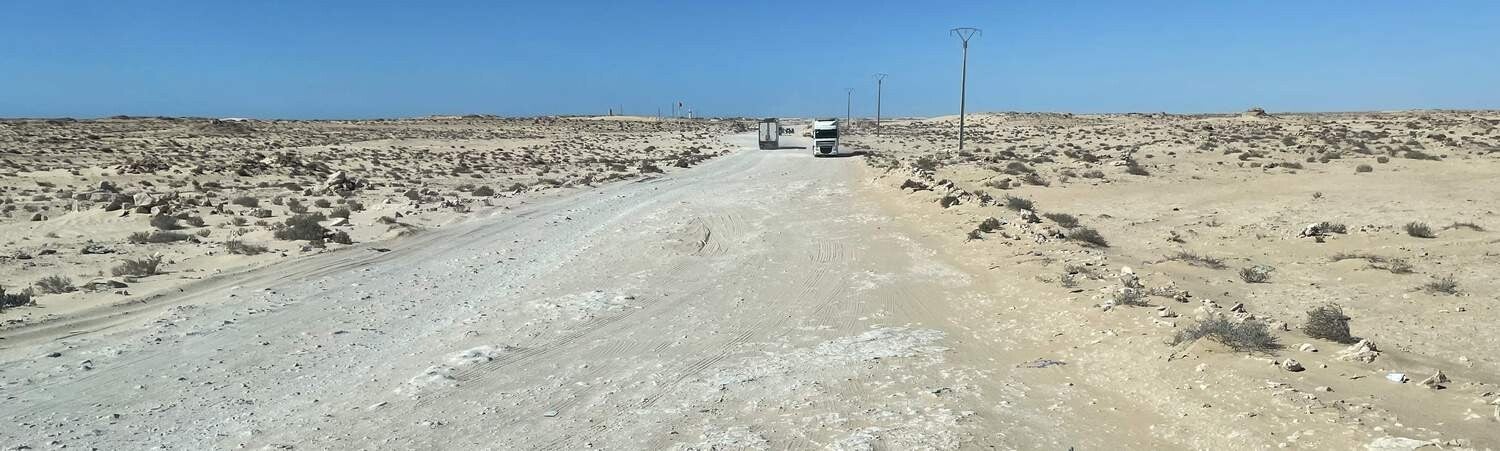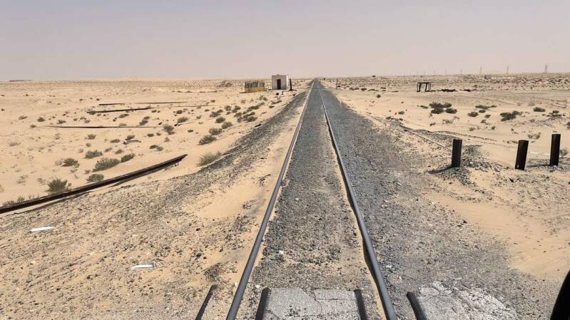 Vorbei an einer schier endlosen Schlange von wartenden LKWs fahren wir jetzt auf eine Halbinsel, in deren Zentrum sich die zweitgrößte Stadt des Landes, Nouadhibou befindet. Dabei überqueren wir auch die Gleise der weltbekannten „Eisenerzbahn“, worauf bis heute noch die schwersten Züge der Welt verkehren.