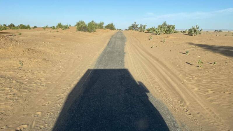Nachdem wir uns nochmals ausgiebig im Meer erfrischt haben, geht es denselben Weg wieder zurück zur Nationalstraße. Eine weitaus kürzere Route würde uns auch von El Mamghar aus, allerdings auf einem schmalen Streifen zwischen den Sanddünen und der Küstenlinie, auf die selbe Straße führen – die s.g. "Ebbstrandpiste". Die ist allerdings hochriskant. Im Falle eines „Steckenbleibens“ und bei gleichzeitig auflaufender Flut, wäre ein Fahrzeugverlust vorprogrammiert – dafür fehlt uns der Mut.