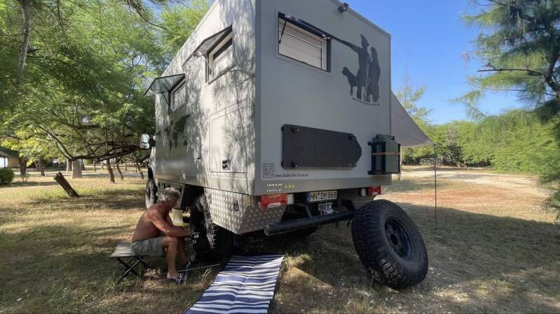 Die folgenden Tage genießen wir am Strand des „Langue de Barbarie NP“ und lassen uns am Abend mit gutem Essen verwöhnen. Nebenbei planen wir natürlich auch die Weiterreise. Ebenso werden die Räder des Iveco im Kreise durchgewechselt. Diesmal wollen wir unbedingt verhindern, dass wir wieder mit vier abgefahrenen und einem neuwertigen Reifen dastehen werden.