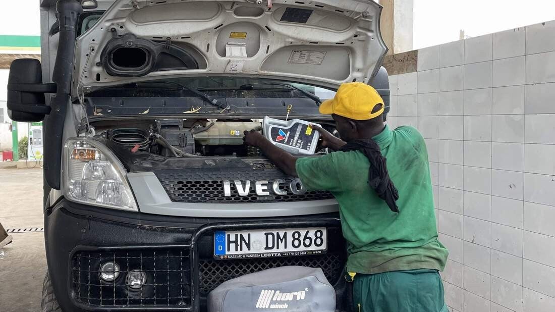 Bevor wir dem Großraum von Dakar den Rücken kehren, lassen wir am Iveco noch einen Ölwechsel vornehmen. Allerdings müssen wir erst bei mehreren Tankstellen nachfragen, ob sie dies auch mit dem von uns mitgebrachten Öl und Filter ausführen. Für wenig Geld und nach nicht einmal 30 Minuten können wir die Halle wieder verlassen und unsere Reise fortsetzen.