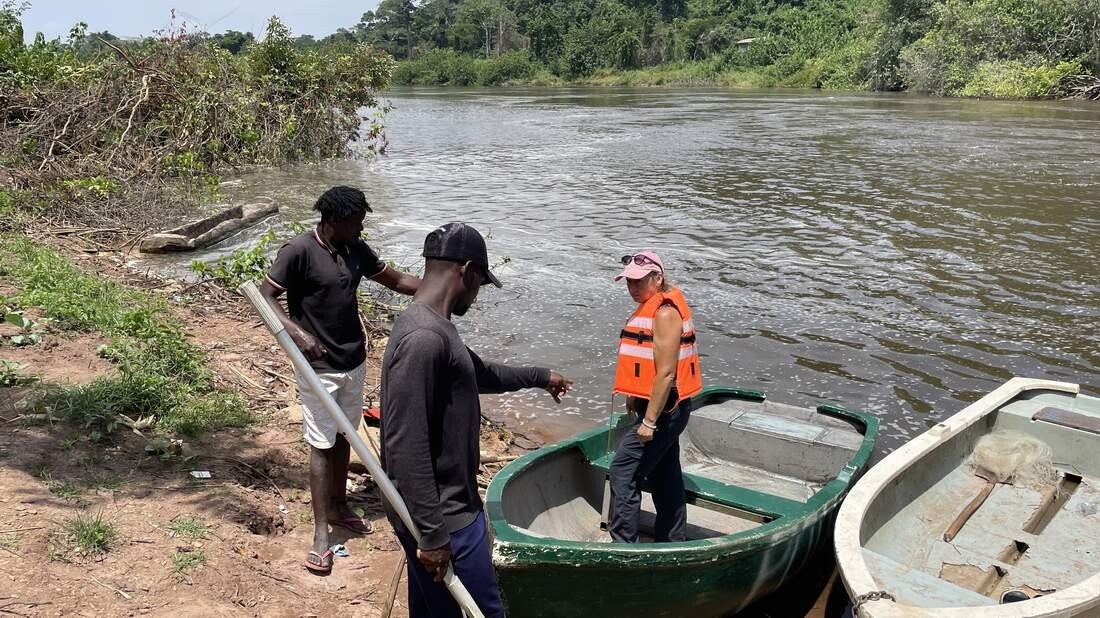 Am nächsten Morgen machen wir uns mit einem lokalen Führer auf den Weg, die gesamten Wasserfälle zu umwandern. Zunächst geht es von der Lodge aus steil zum Fluss hinunter. Immer wieder erhalten wir durch das dichte Grün tolle Ausblicke auf die Wasserfälle. Zum ersten Mal können wir auch die gesamte Breite von 400m sehen, über die das Wasser 120m in die Tiefe stürzt. Mit einem kleinen Böötchen setzen wir ans andere Ufer über.