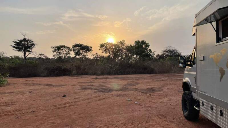 Auf feinstem Asphalt rollen wir Jaounde, der Hauptstadt Kameruns entgegen. Wir können es kaum glauben, wie ruhig und rüttelfrei unser Iveco dahinrollt – und das mit mehr als nur in zwei Gängen. Am Abend dann noch ein wunderschöner Sonnenuntergang.