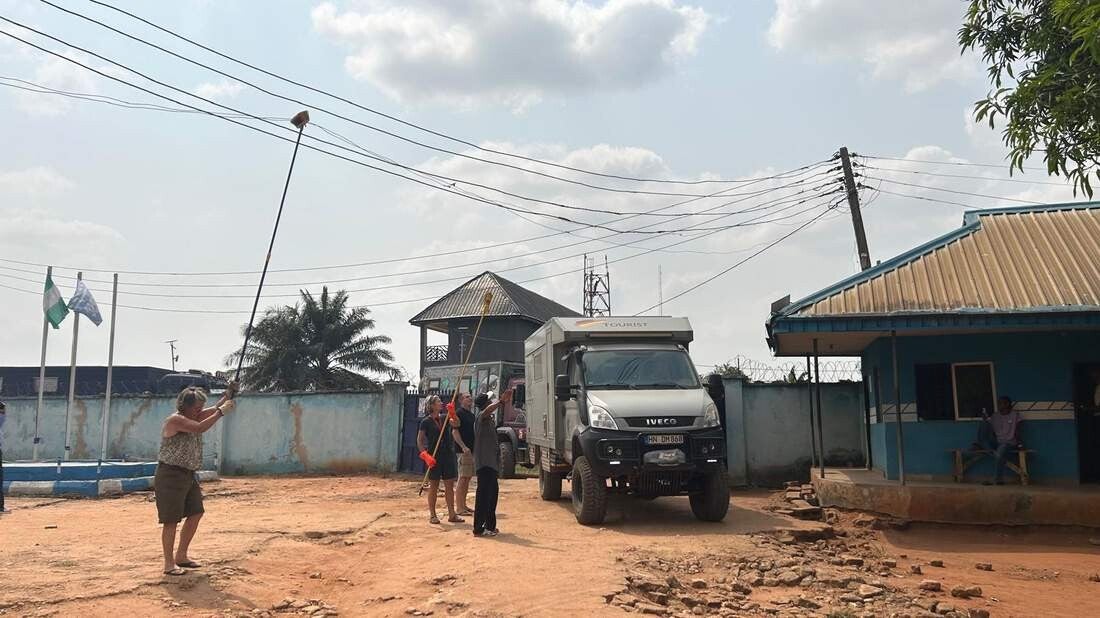 Einen sehr interessanten Übernachtungsplatz finden wir in der Kommandantur der Verkehrspolizei in Benin-City. Allerdings gestaltet sich die Einfahrt, wegen der tiefhängenden Kabel, für die größeren Fahrzeuge unter uns doch als recht schwierig. Nicht nur, dass wir hier kostenlos stehen können. Am Abend kommt auch noch ein „offizieller“ Geldwechsler vorbei, so dass wir reichlich unsere Euros bzw. Dollars in nigerianische Neira tauschen können. Zudem lässt man uns auch die Wassertanks der Fahrzeuge füllen.