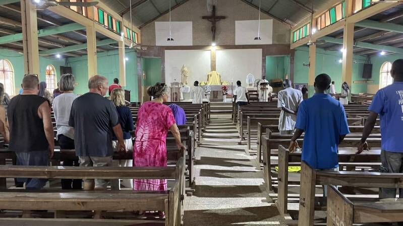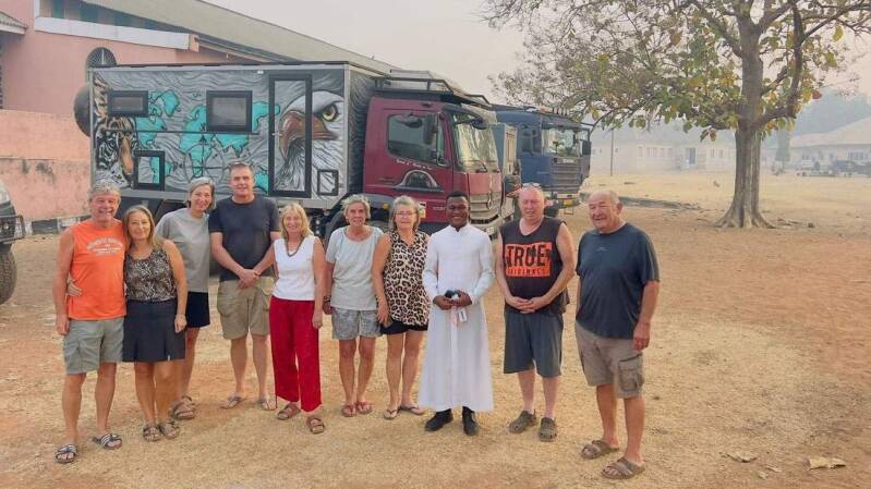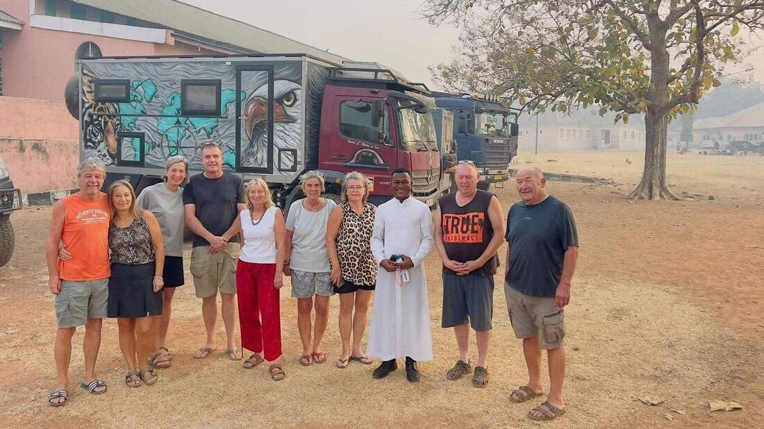 Über eine recht abenteuerliche Piste, die am Ende noch über die örtliche Müllkippe führt, erreichen wir den nächsten Stellplatz – die „Mission St. Gerard Majella“ in Katsina-Ala. Nach einem Fußballspiel mit dem Pfarrer und seinen Jungs gibt es ein Mannschaftsbild. Danach besuchen wir gemeinsam die Messe. Zum Ende der Messe bedankt sich der Pfarrer sogar noch bei uns für den Besuch.