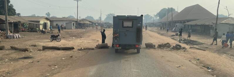 Freies Stehen ist in Nigeria, sofern man sich nicht fernab von Städten oder in den Bergen befindet, ein sehr schwieriges Unterfangen. Offiziell ist es nicht verboten. Doch die Polizei oder sonstige Sicherheitskräfte bringen sehr deutlich zum Ausdruck, dass dies die allgemeine Sicherheitslage im Land nicht zulässt. Selbst bei einer Mittagspause, nur wenige Meter neben der Straße, wurden wir bereits in Togo darauf hingewiesen, dass das nicht gestattet ist. Niemand könnte hier unsere Sicherheit gewährleisten.