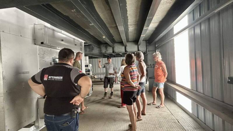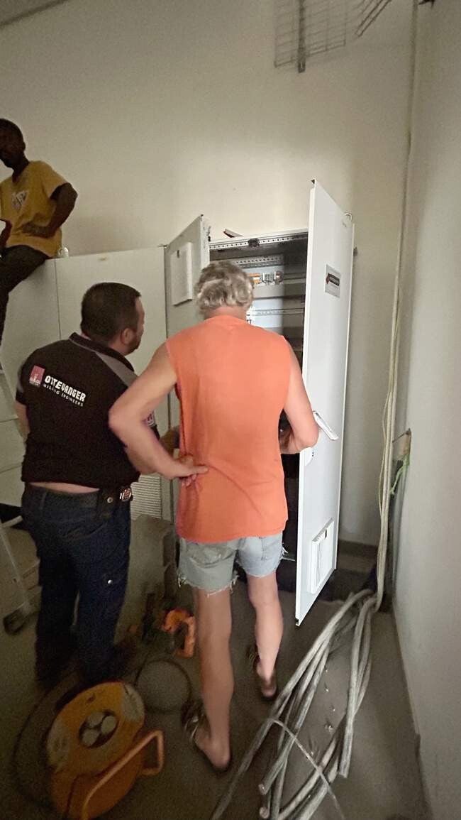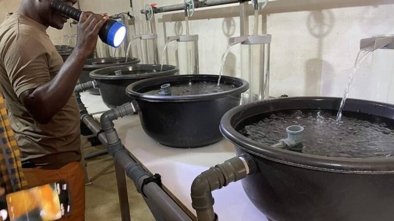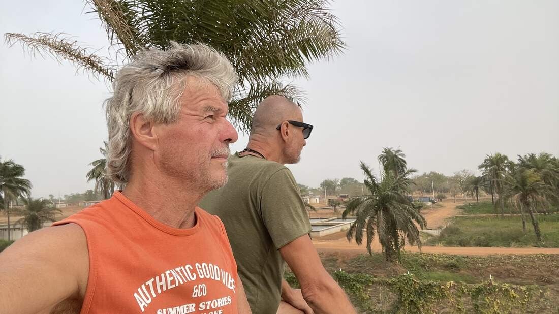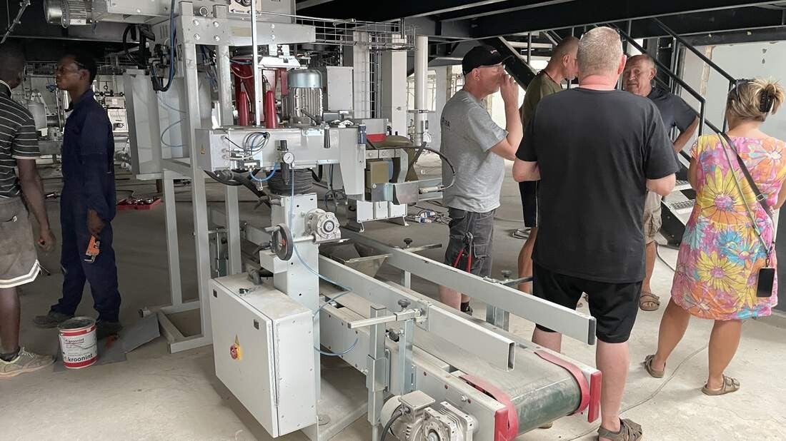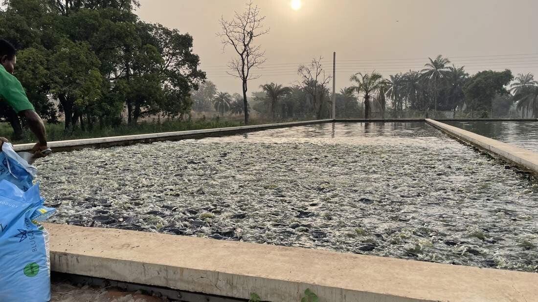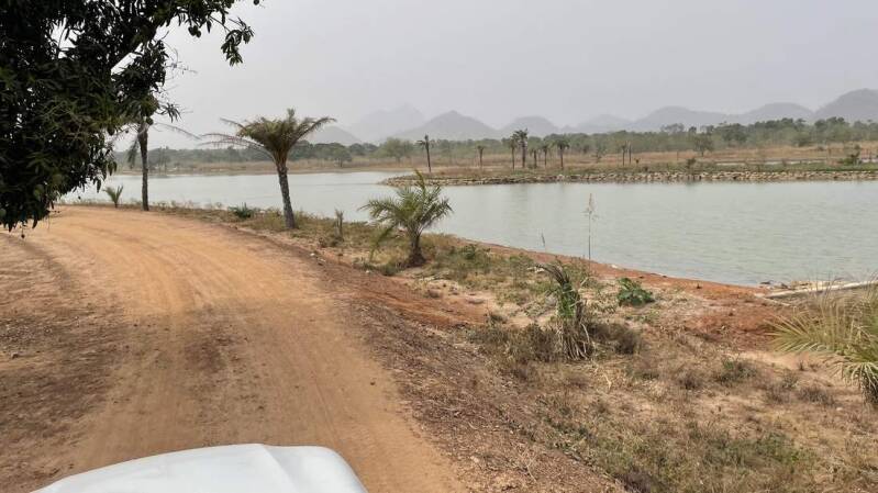 Auf der Ladefläche eines Pickups erkunden wir danach das weitläufige Gelände um den farmeigenen Stausee. Unmittelbar neben der Farm entsteht z.Zt. eine vollautomatische Fischfutter Produktion. Auch hier erhalten wir eine exklusive Führung. Sehr zur Freude von Hajo, hier kann er ausgiebig mit einem „Kollegen“ über die eingesetzten Automatisierungstechniken fachsimpeln. Nach wie vor stehen wir unter dem Einfluss des Wetterphänomens Harmattan, der die Luft mit Sand und Staub aus der Sahara sättigt.